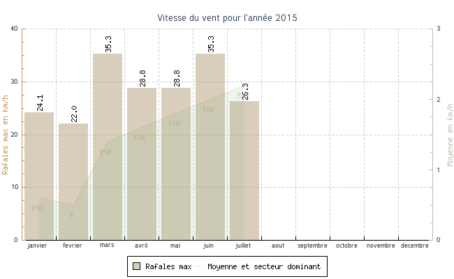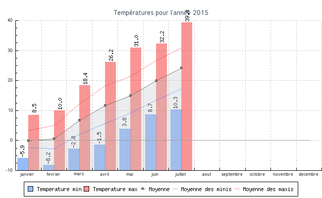 | juillet | 10.3 °C | 17.3 °C | 39.4 °C | 31.0 °C | 24.2 °C | 2.2 km/h | 26.3 km/h | ENE |